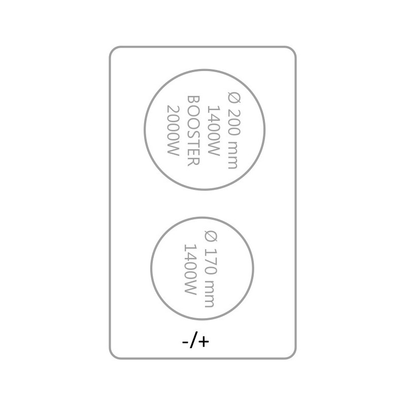 Equipée de deux zones induction d'une puissance totale de 3600 watts, son foyer avant est de 1500W en diamètre 17 cm et arrière de 2200W en diamètre 20cm à Booster. Ses commandes se font par touches sensitives à 9 niveaux de chauffe, ceux-ci permettent d'effectuer toutes les préparations de cuisson et la rende utilisable de façon claire et simple par de nombreux utilisateurs.