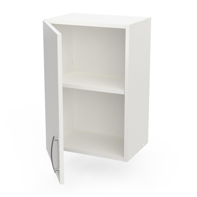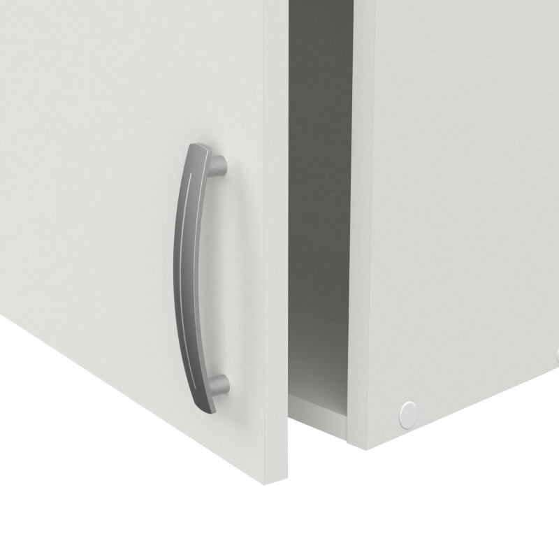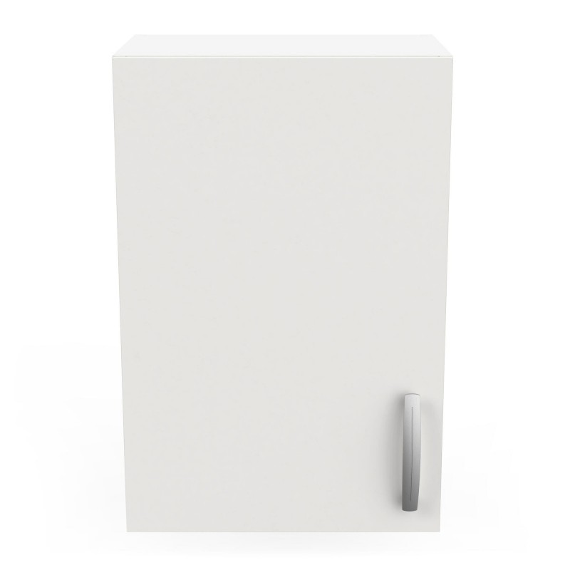 En mélamine. Elément haut 1 porte. Fixations murales réglables. 1 rayon réglable 3 niveaux. Surface rayon utile: 37x24cm. Dimensions meuble monté (lxPxH mm) 400x280x600